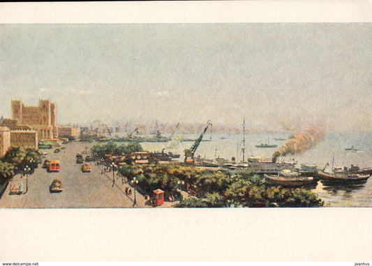 painting by N. Abdurakhmanov and N. Kasumov - Baku view - port - Azerbaijan art - 1954 - Russia USSR - unused