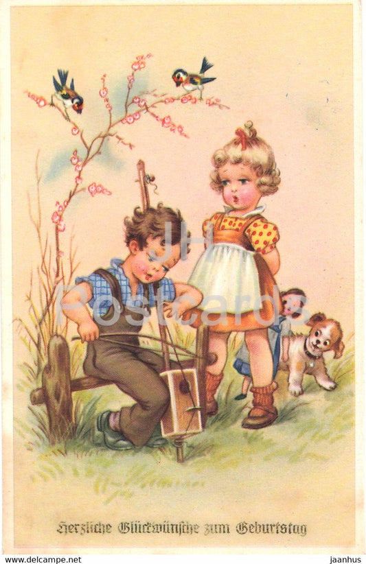 Birthday Greeting Card - Herzliche Gluckwunsche zum Geburtstag - boy - girl - dog - old postcard - Germany - used