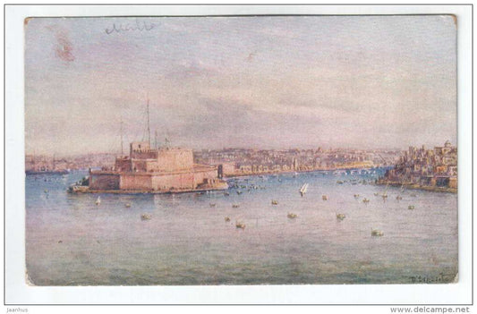 Fort St. Angelo and Dockyard Creek , illustration by Esposito - by Critien`s - old postcard - Malta - used