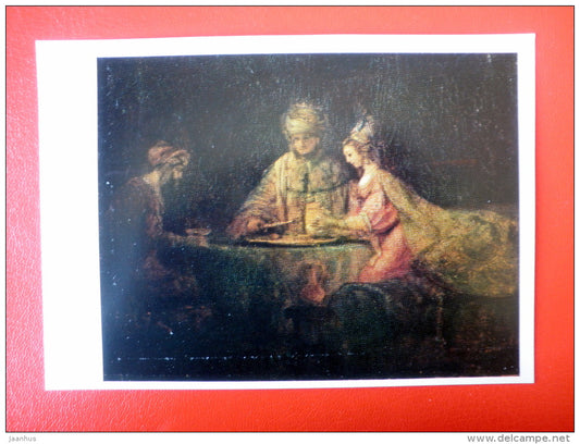 painting by Rembrandt . Ahasueras, Haman and Queen Esther - dutch art - unused