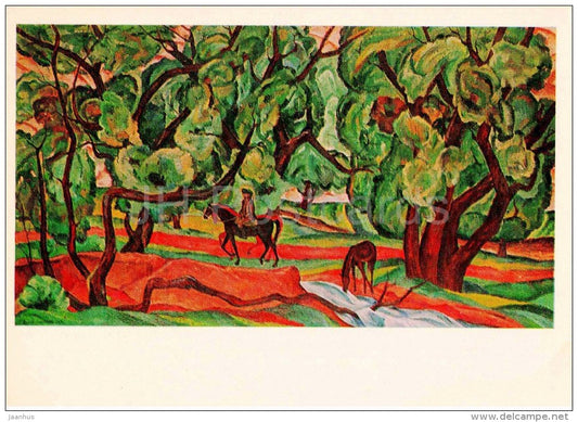 painting by Y. Bayramov - A Peaceful Scene , 1969 - horses - turkmenian art - unused