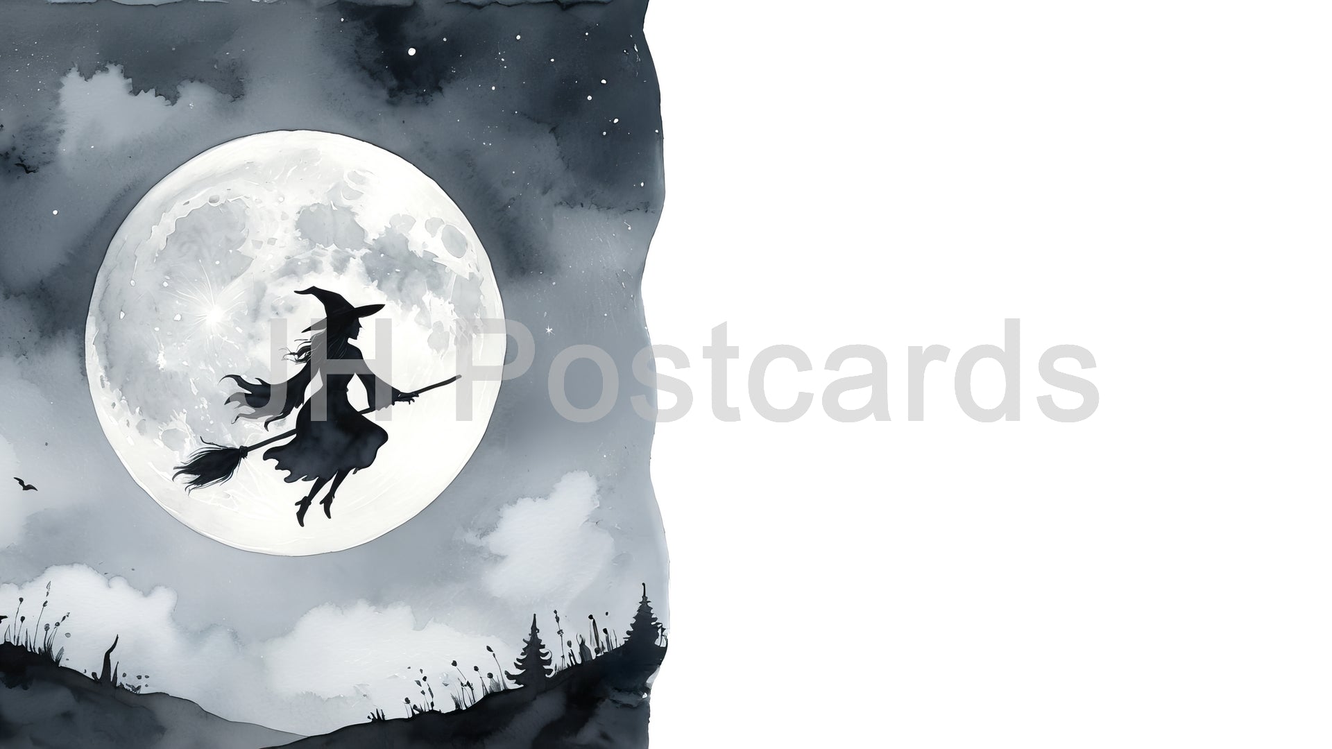 AI-Bild - Ein eindringliches Aquarell einer Hexe, die sich vor einem leuchtenden Vollmond abhebt und das Mysterium des Nachthimmels einfängt. Halloween. Zeichnung. Kunst. Illustration. Platz zum Kopieren. 2