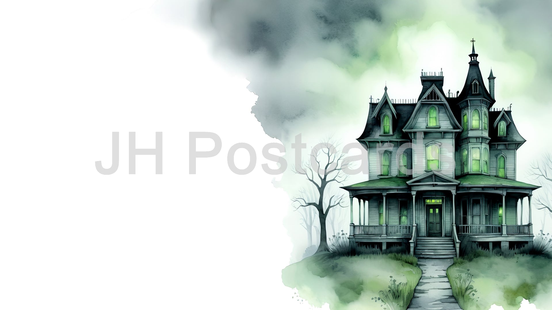 AI-Bild – Das Geheimnis des Spukhauses: Ein gruseliges Aquarell eines Spukhauses, das in Nebel gehüllt ist und dessen Fenster von unheimlichen grünen Lichtern erhellt werden. Halloween. Zeichnung. Kunst. Illustration. Platz zum Kopieren. 3