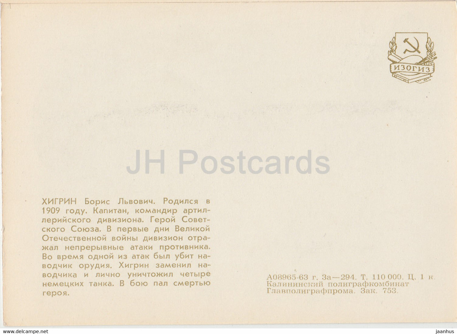 B. Higrin – Sowjetische Helden des Zweiten Weltkriegs – Kanone – Illustration von L. Kotlyarov – 1963 – Russland UdSSR – unbenutzt