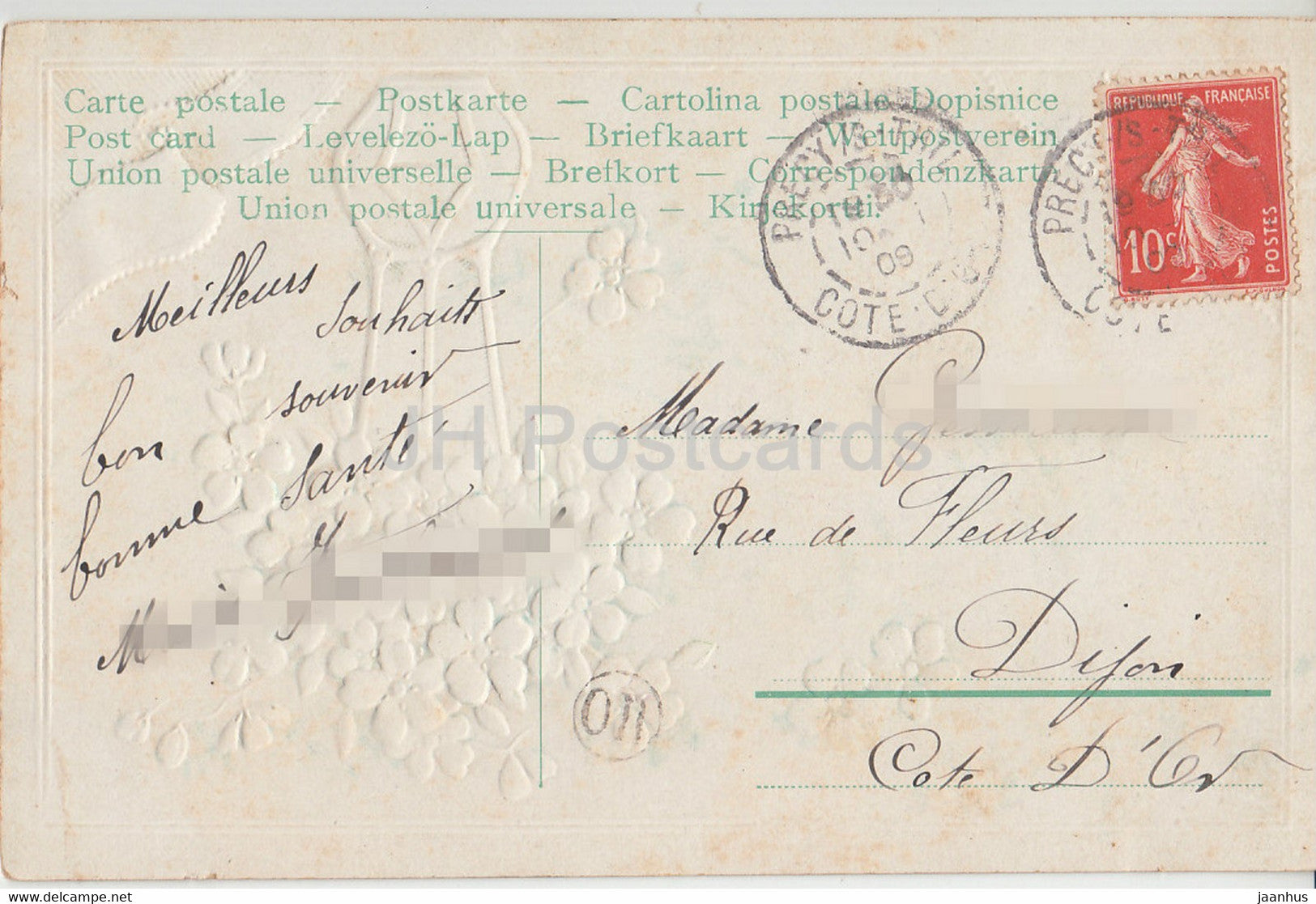 blaue Blumen in einer Vase - Ne m'oubliez pas - Illustration - alte Postkarte - Frankreich - 1909 - gebraucht