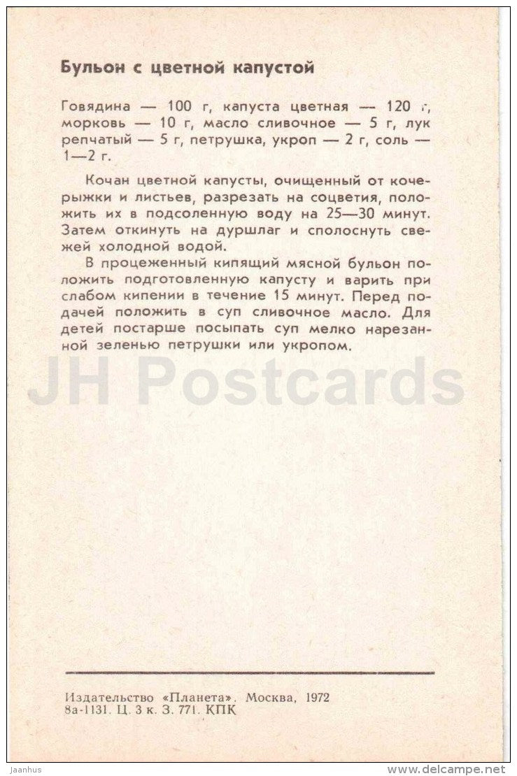 Blumenkohlsuppe – Essen für Kinder – Gerichte – Küche – 1972 – Russland UdSSR – unbenutzt