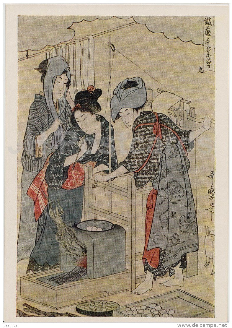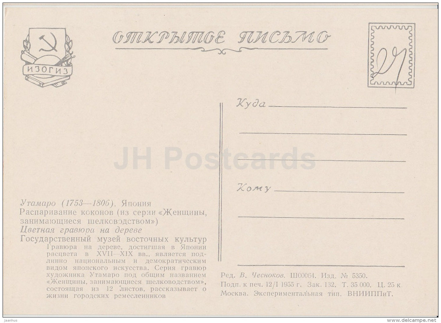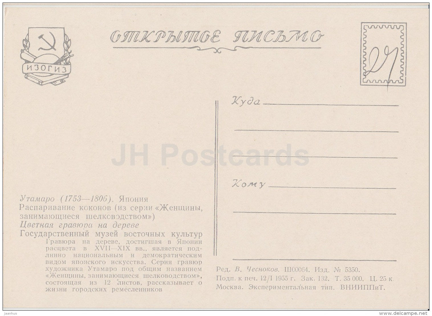 Farbholzschnitt von Utamaro – Dampfende Kokons – Seidenraupenzucht – Frauen – japanische Kunst – 1955 – Russland UdSSR – unbenutzt
