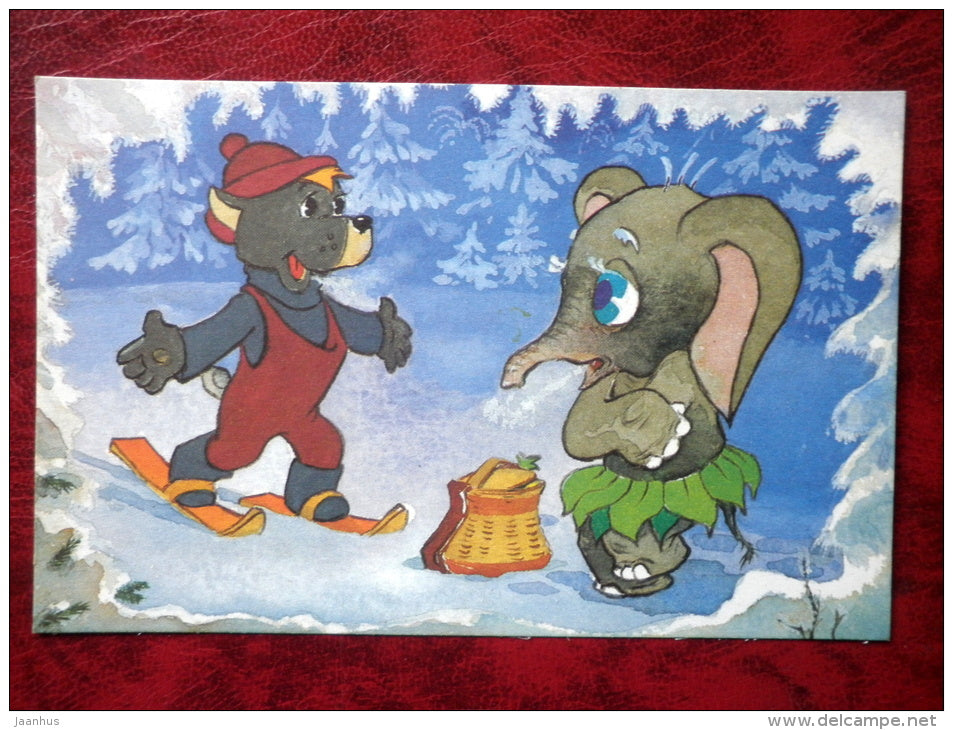 Come and Visit von LL Kayukov, Cartoon-Karten – Wolf – Elefant – 1988 – Russland – UdSSR – unbenutzt