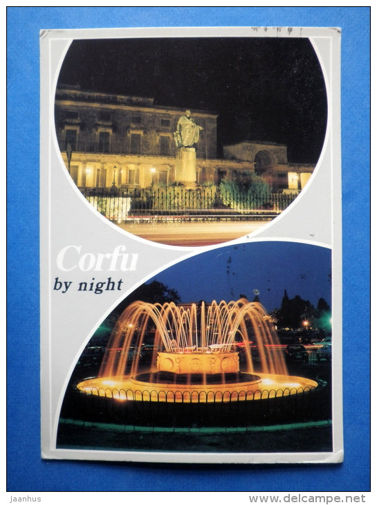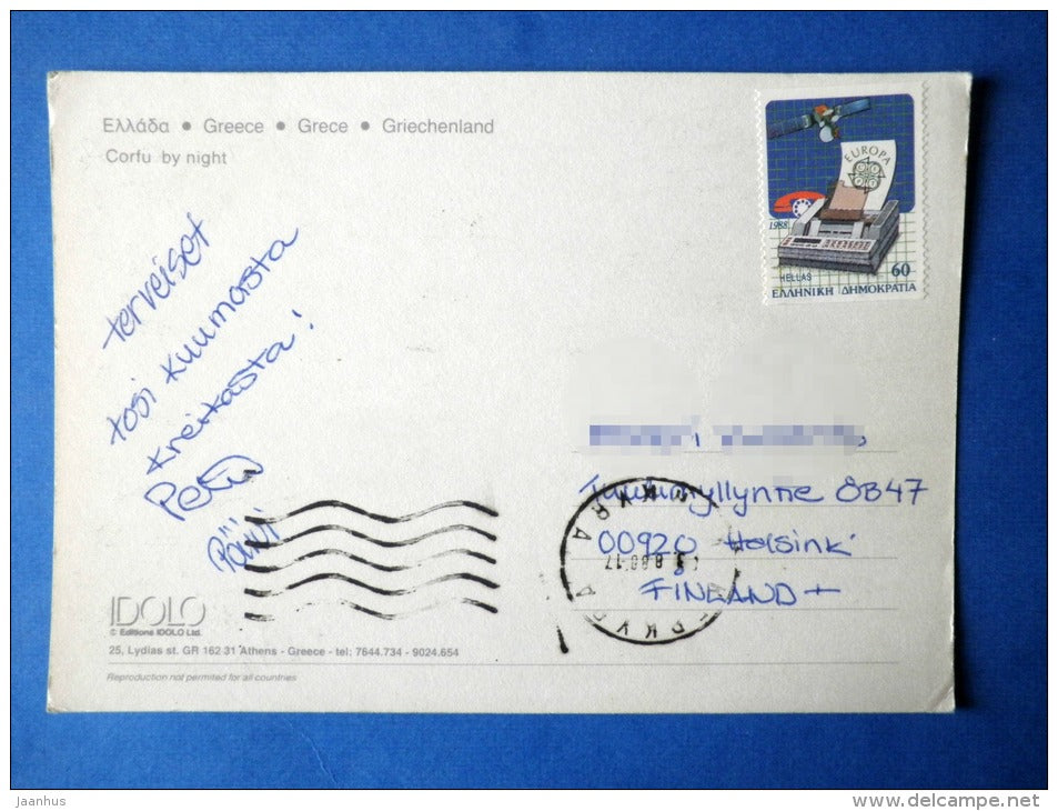 Korfu bei Nacht – Brunnen – Briefmarke EUROPA 1988 – geschickt von Griechenland nach Finnland 1988 – Griechenland – gebraucht