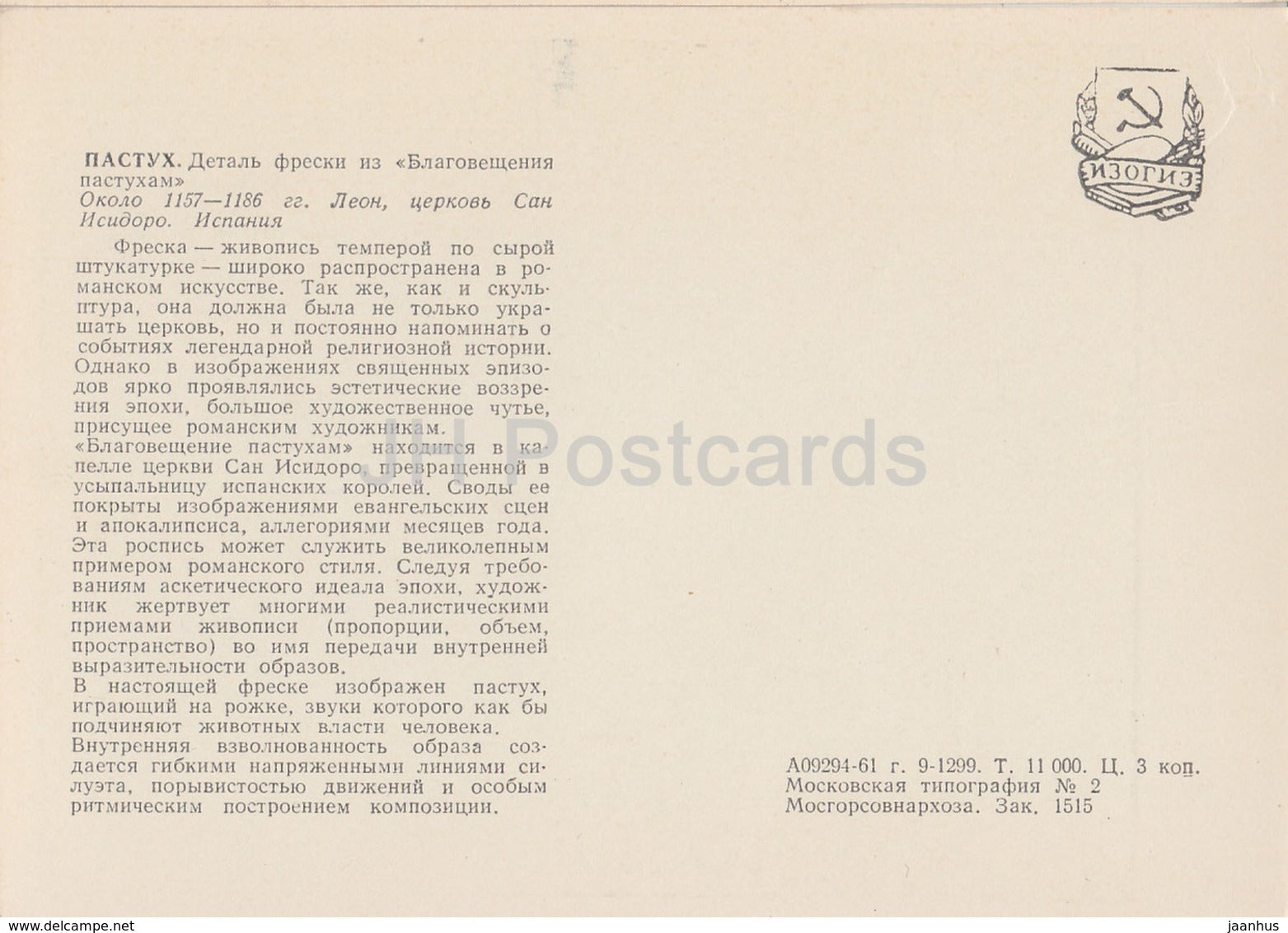 Detail eines Freskos aus der Verkündigung an die Hirten – Hirte – 1961 – Russland UdSSR – unbenutzt