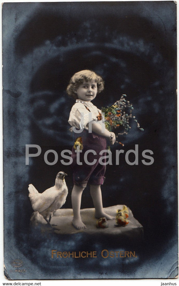 Ostergrußkarte - Frohliche Ostern - Junge - Huhn - alte Postkarte - 1917 - Deutschland - gebraucht