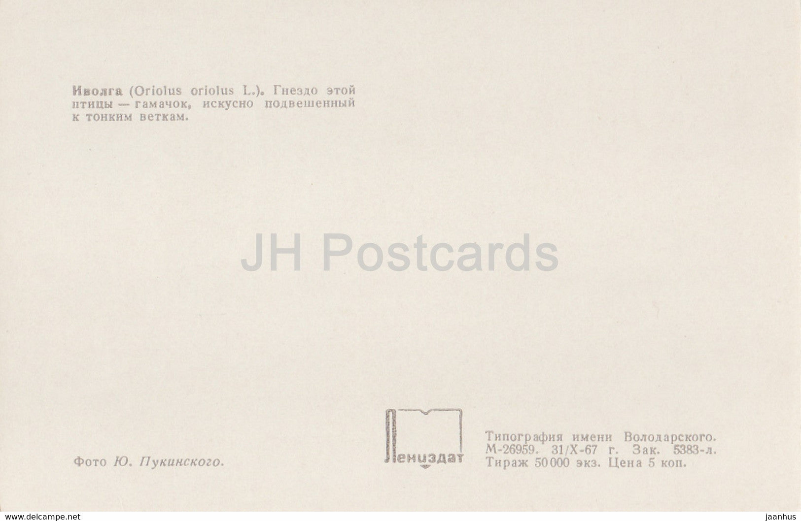 Eurasischer Pirol - Oriolus oriolus - Vögel - 1968 - Russland UdSSR - unbenutzt