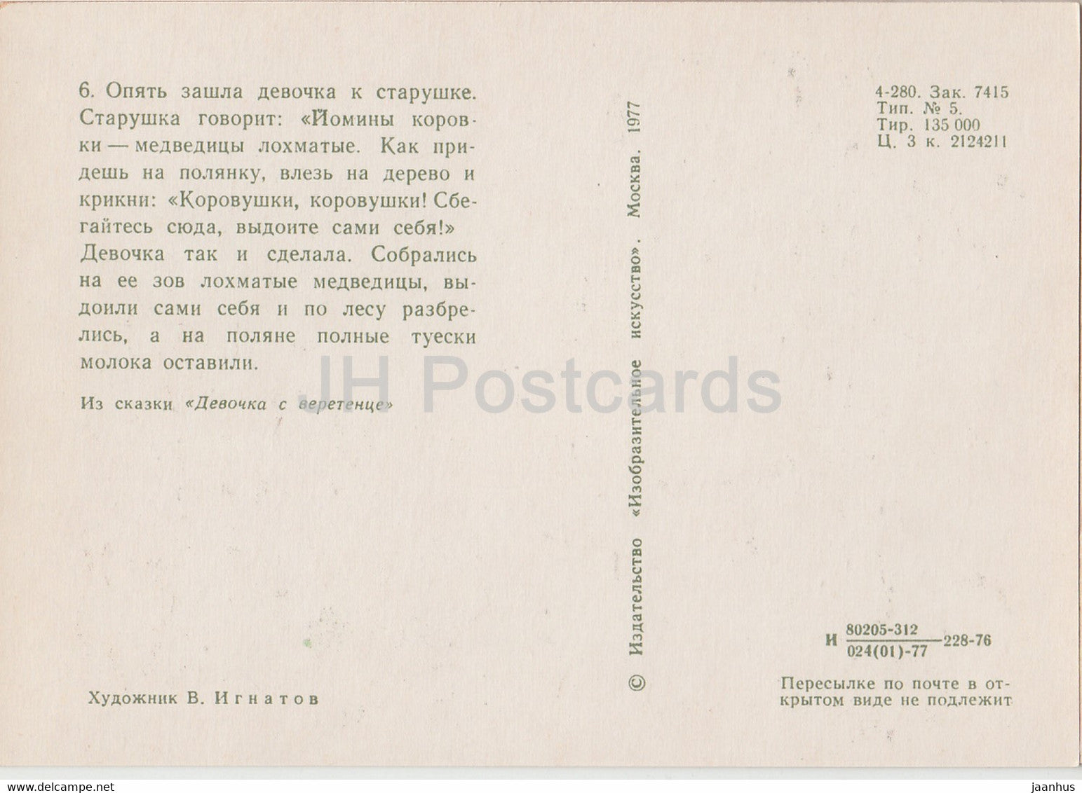 Illustration von V. Ignatov – Mädchen mit Spindel – Bären – Komi-Märchen – 1977 – Russland UdSSR – unbenutzt