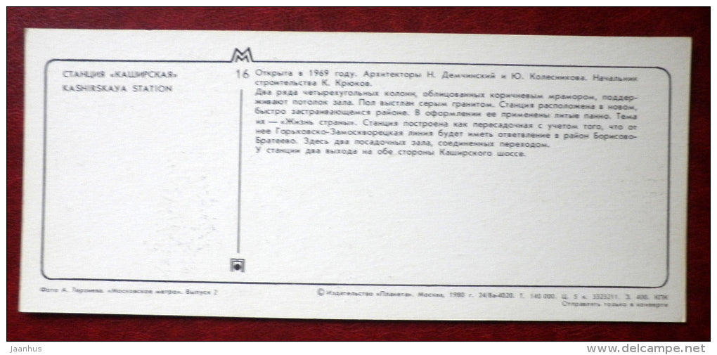 Station Kashirskaya – Die Moskauer Metro – U-Bahn – Moskau – 1980 – Russland UdSSR – unbenutzt