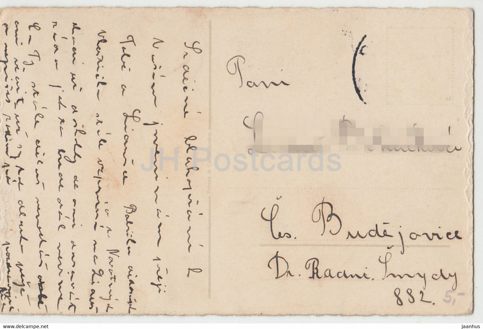 Namensgrußkarte - Srdecne blahoprani k jmeninam - Hund und Mädchen - Illustration - alte Postkarte - Tschechische Republik - gebraucht