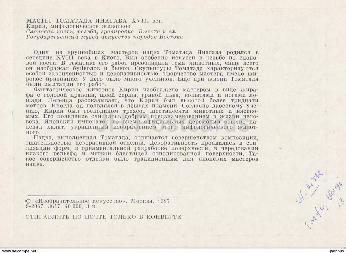 Netsuke von Meister Tomotada Yanagawa – Kirin – Elfenbein – japanische Kunst – 1987 – Russland UUSR – unbenutzt