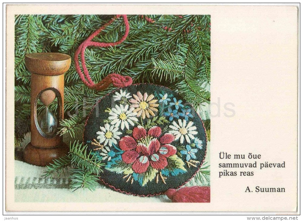 Neujahrsgrußkarte – 1 – Sanduhr – Stickerei – 1984 – Estland UdSSR – gebraucht
