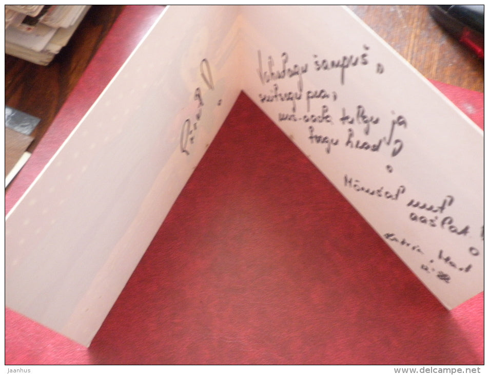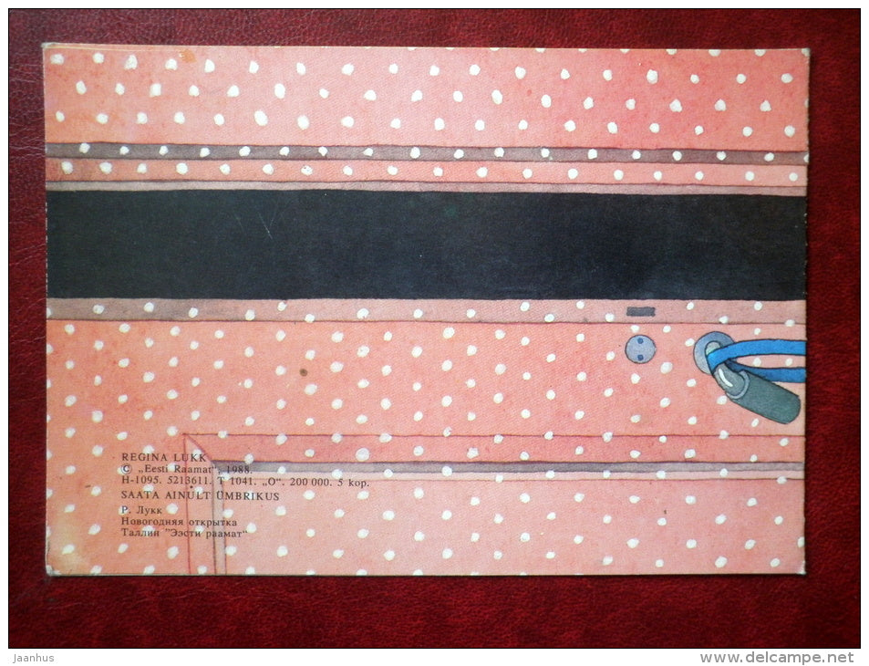Neujahrsgrußkarte – von R. Lukk – Geschenke in Socken – Puppe – Horn – Pistole – 1988 – Estland UdSSR – gebraucht