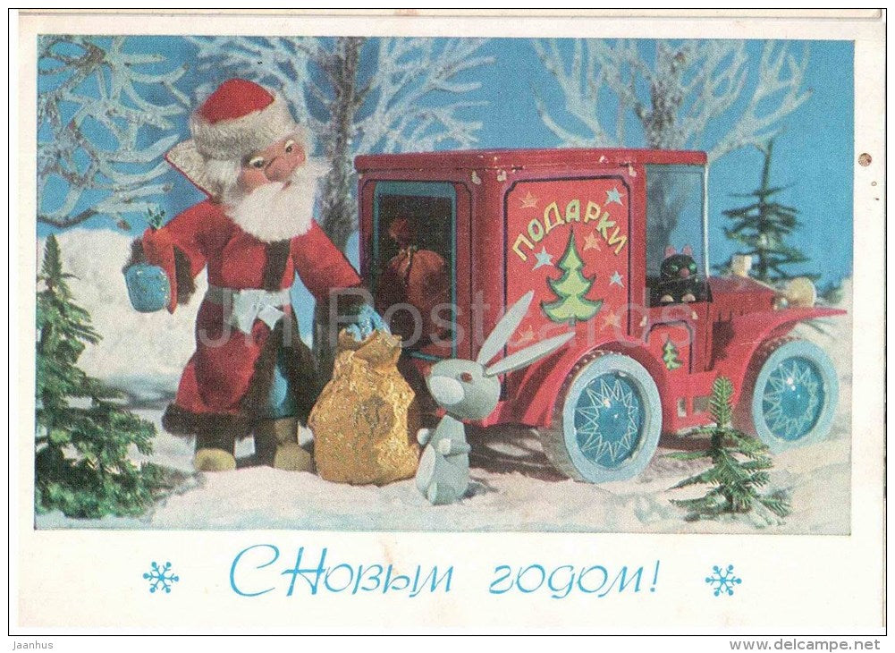 Neujahrsgrußkarte – Ded Moroz – Spielzeugauto – Hase – Marionette – Schreibwaren – 1981 – Russland – UdSSR – unbenutzt
