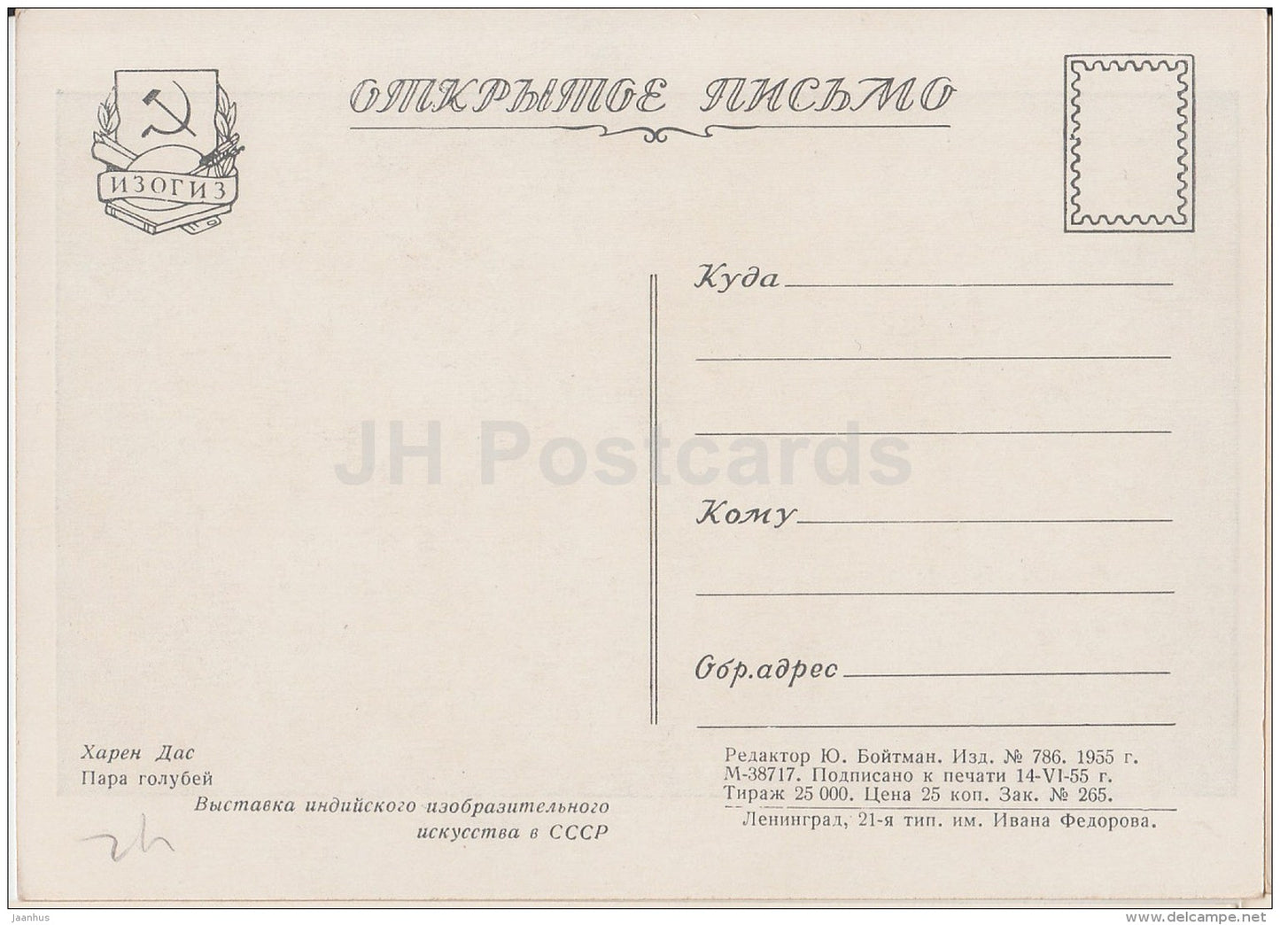 Gemälde von Haren Das – Taubenpaar – Frau – Indische Kunst – 1955 – Russland UdSSR – unbenutzt