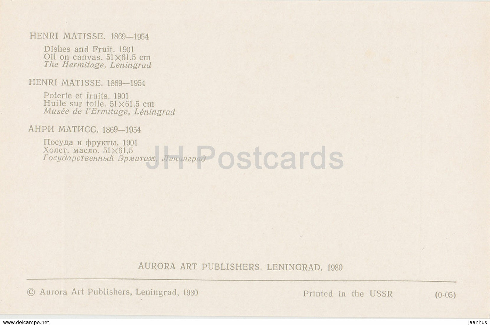Gemälde von Henri Matisse – Gerichte und Obst – Französische Kunst – 1980 – Russland UdSSR – unbenutzt