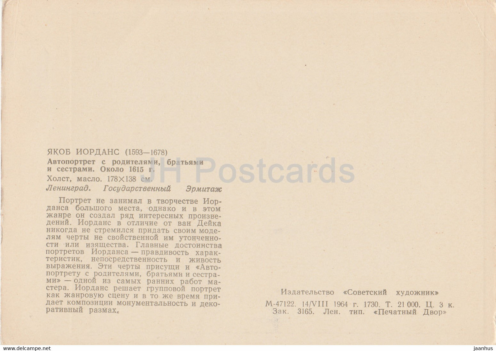 Gemälde von Jacob Jordaens – Selbstporträt mit Eltern und Geschwistern – Flämische Kunst – 1964 – Russland UdSSR – unbenutzt