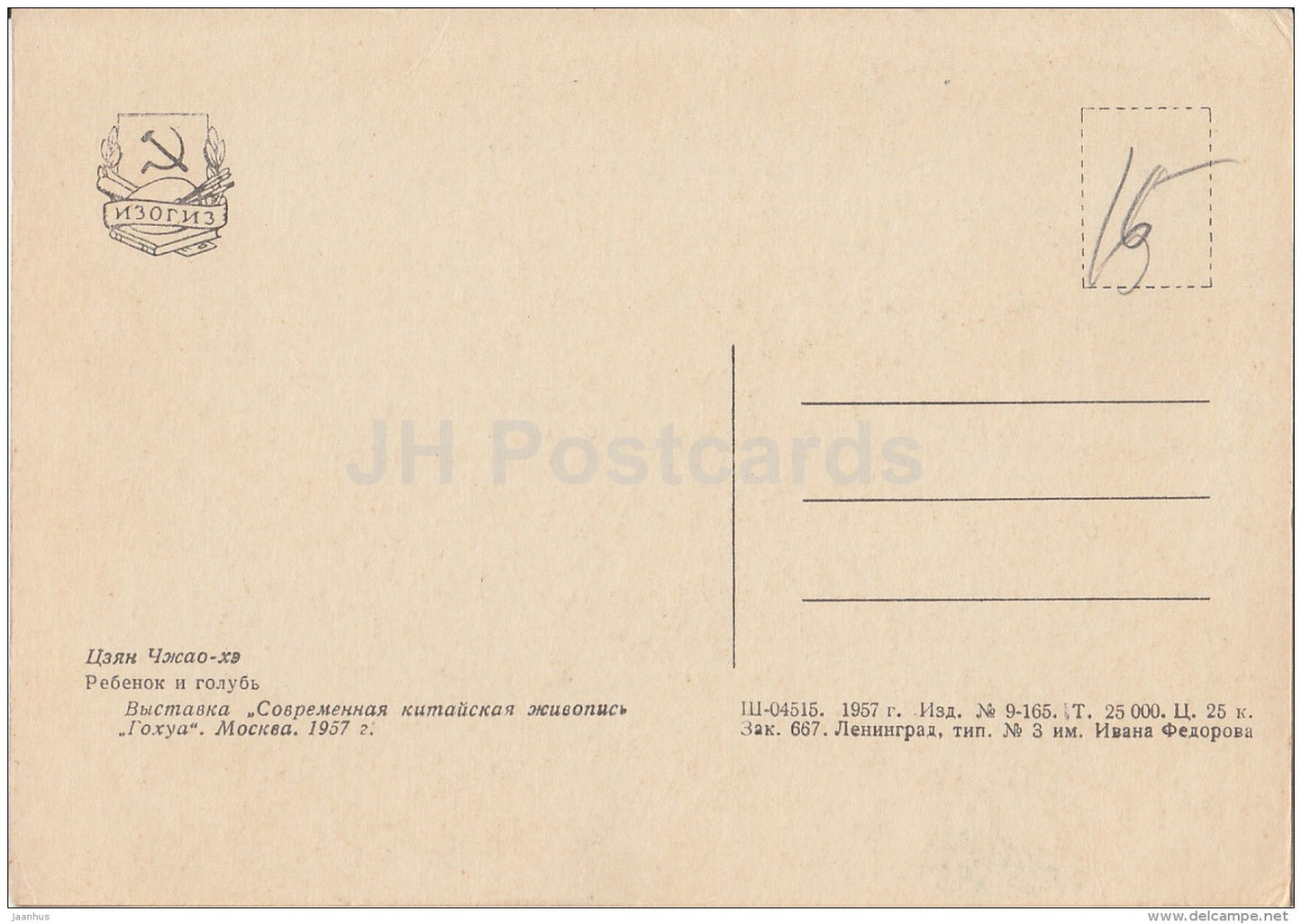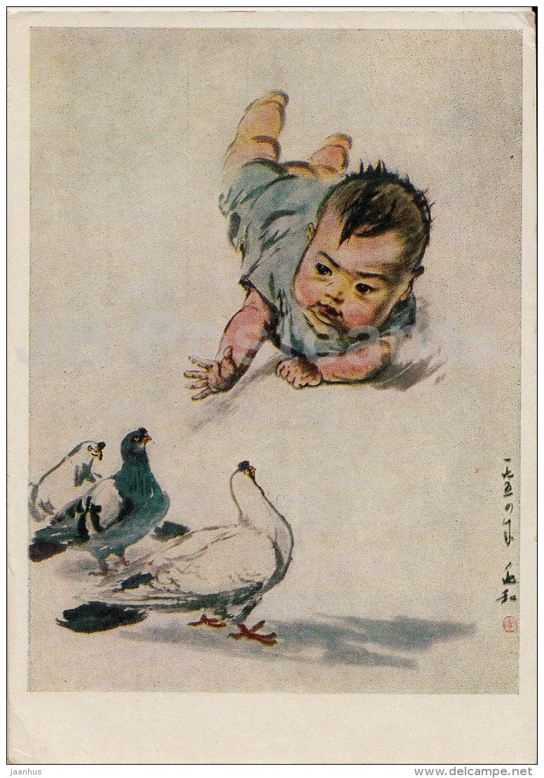 Gemälde von TZYAN CHZAO-KHE – Kind und Tauben, 1957 – Vögel – Chinesische Kunst – 1957 – Russland UdSSR – unbenutzt
