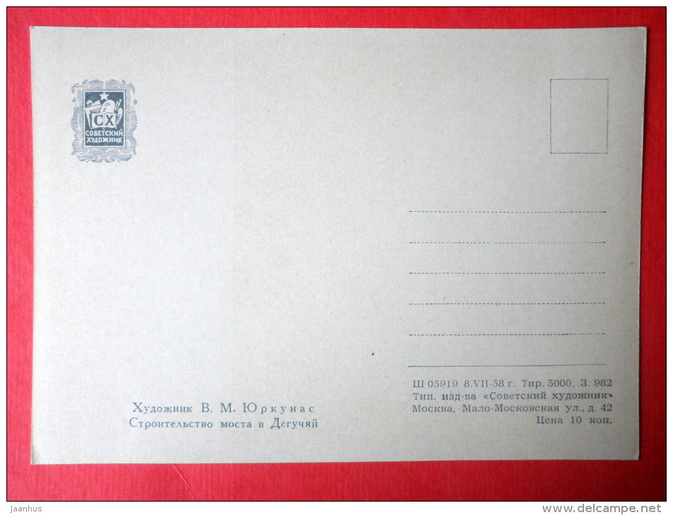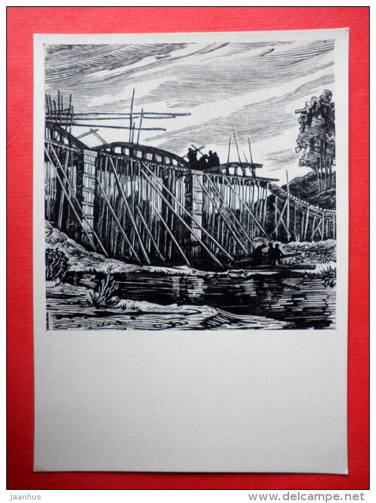 Gemälde von V. Jurkunas – Brückenbau in Deguciai – litauische Kunst – unbenutzt