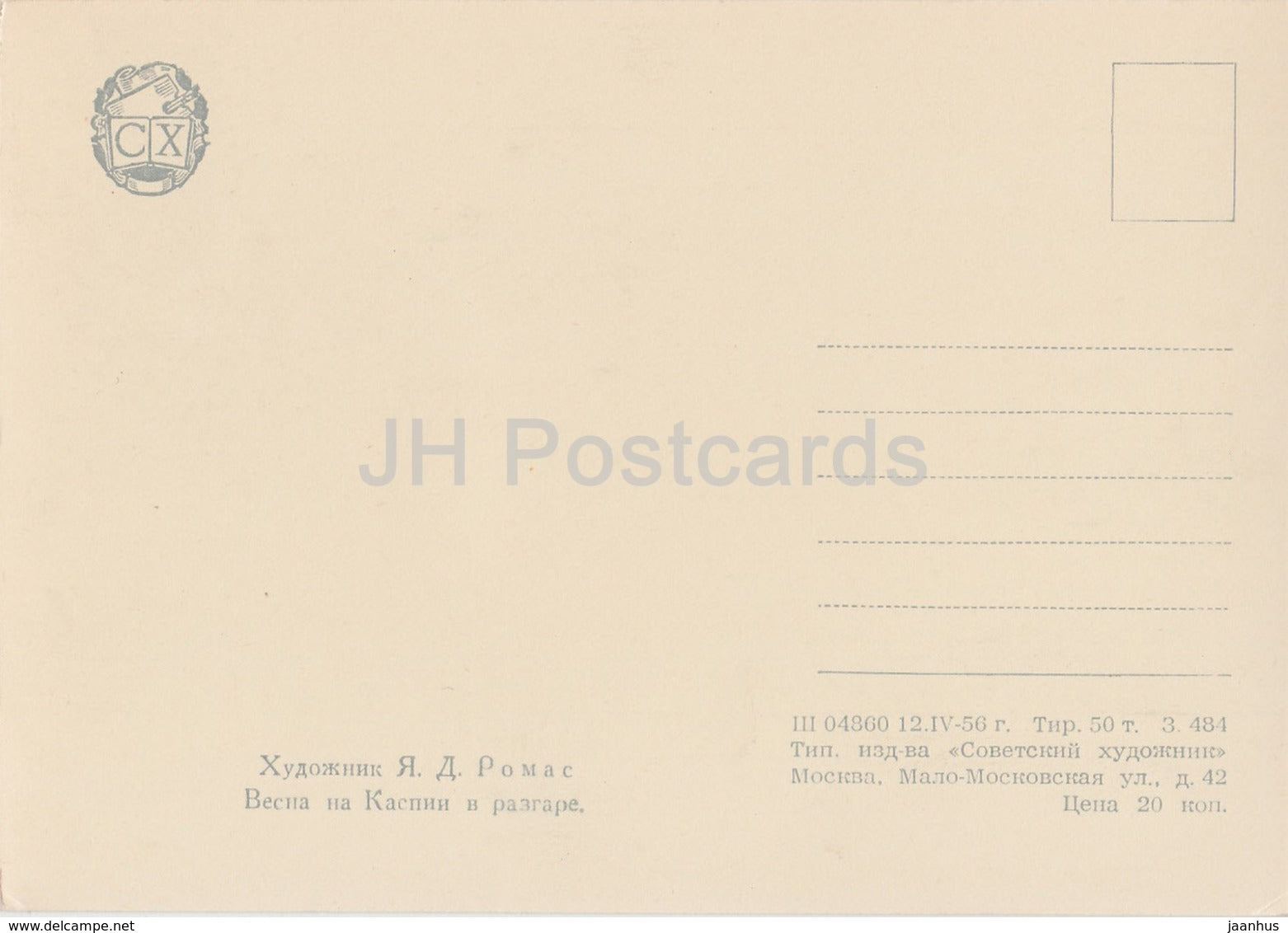 Gemälde von Y. Romas – Der Frühling ist in vollem Gange im Kaspischen Meer – Boot – Russische Kunst – 1956 – Russland UdSSR – unbenutzt