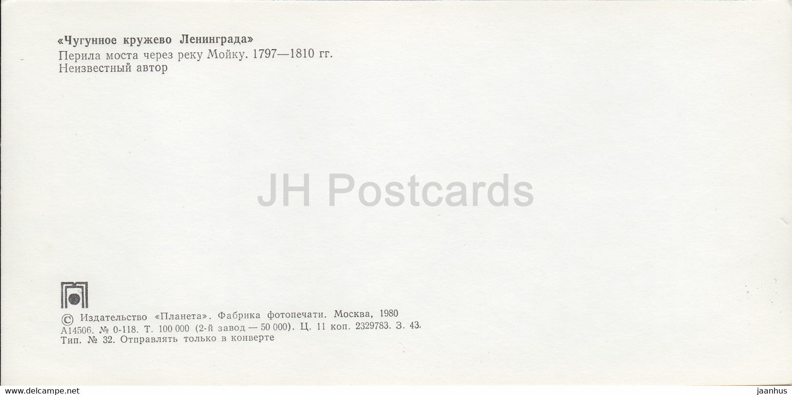 Geländer der Brücke über den Fluss Moika – St. Petersburg – Gusseiserne Spitze von Leningrad – 1980 – Russland UdSSR – unbenutzt