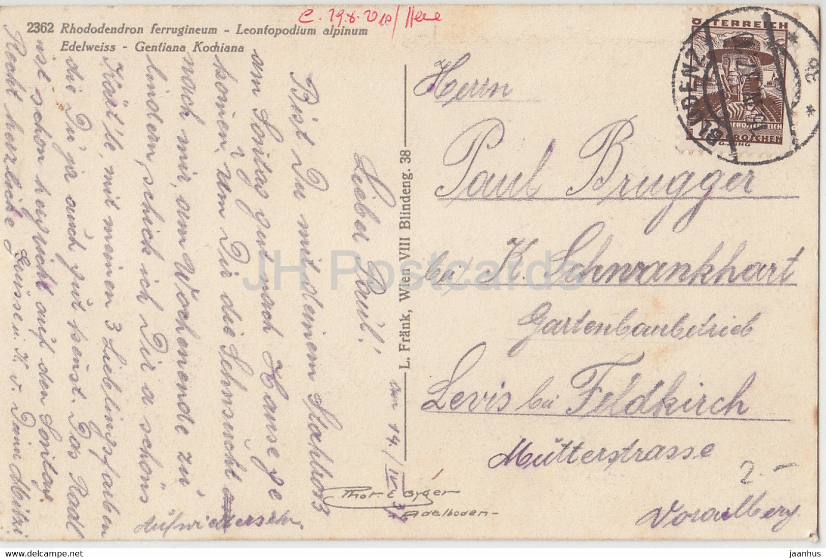 Rhododendron ferrugineum - Leonfopodium alpinum - Edelweiß - Blumen - 2362 - alte Postkarte - 1937 - Schweiz - gebraucht