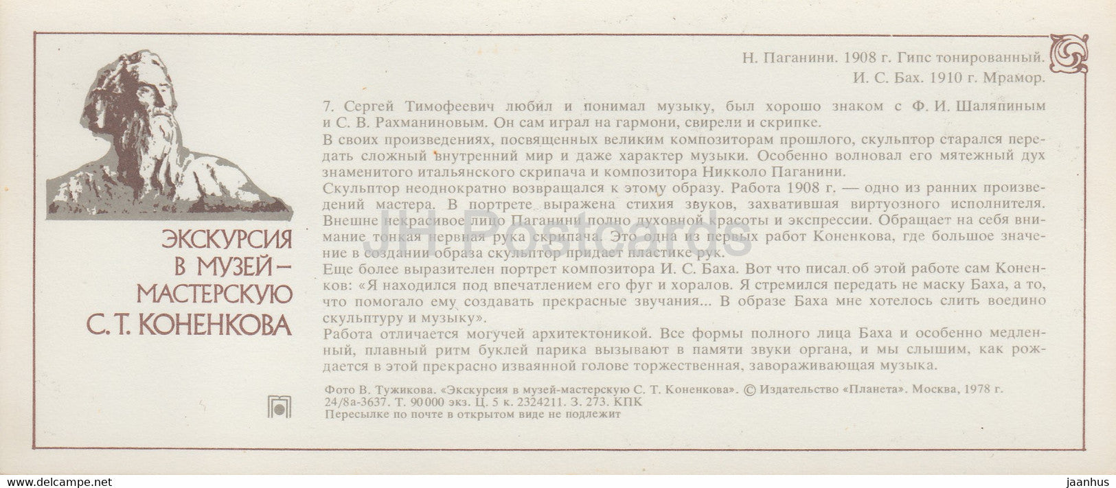 Russischer Bildhauer S. Konenkov Museum – italienischer Geiger Niccolo Paganini – Komponist Bach – 1978 – Russland UdSSR – unbenutzt