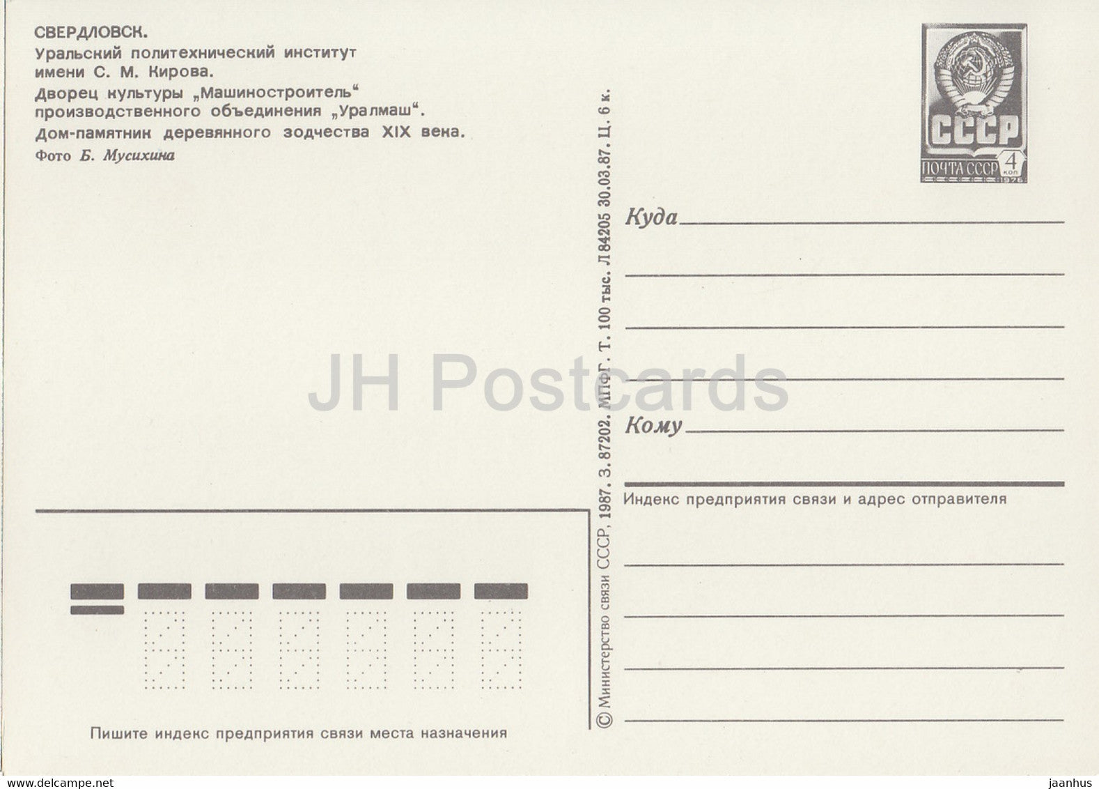 Swerdlowsk – Jekaterinburg – Ural Polytechnisches Institut – Kulturpalast – 1987 Russland UdSSR – unbenutzt