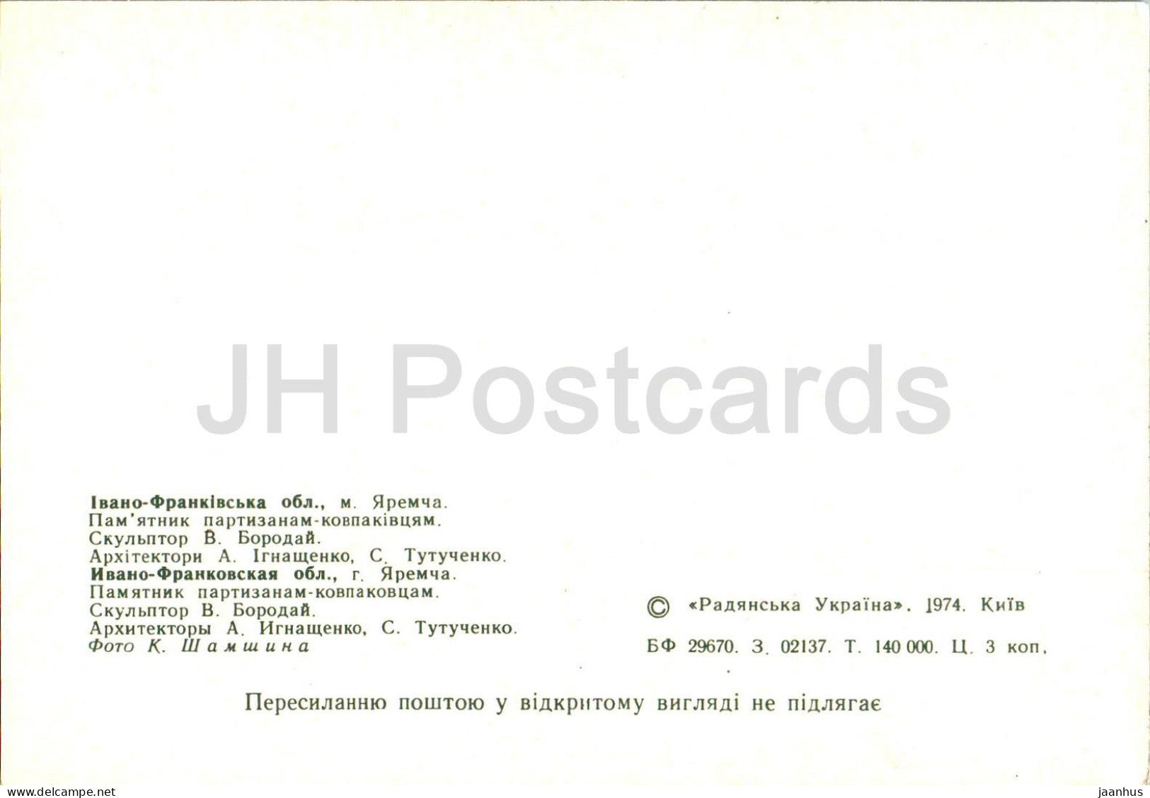 Jaremtsche – Gebiet Iwano-Frankiwsk – Denkmal für die Kopakow-Partisanen – 1974 – Ukraine UdSSR – unbenutzt