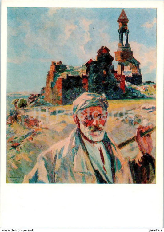 peinture de E. Isabekyan - Vieil homme de Byurakan et du temple d'Artavazd - art arménien - 1974 - Russie URSS - inutilisé