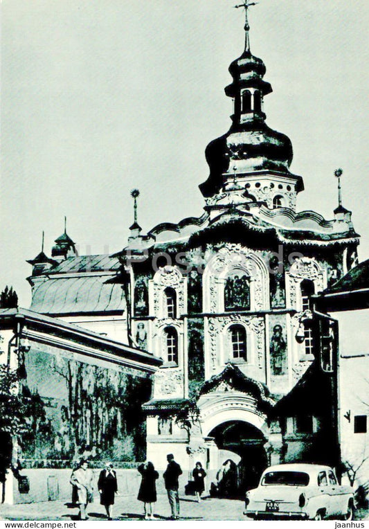 Entrée principale de la réserve de Kiev-Petchersk - Façade ouest de l'église de la Trinité, voiture Moskvitch - 1964 - Ukraine URSS - inutilisée
