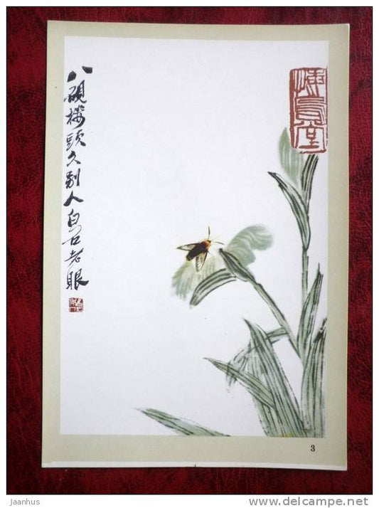 Art chinois - peinture de Chi Pai Shih - abeille et iris - fleurs - imprimé sur papier fin - Russie - URSS - inutilisé