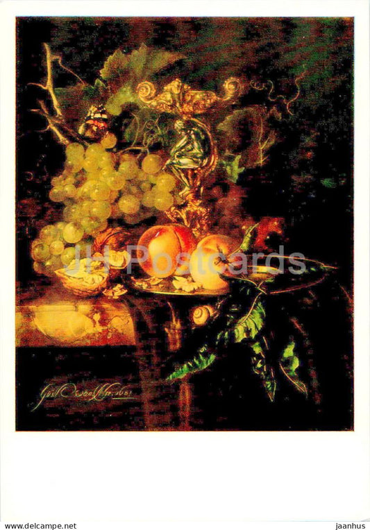 peinture de Willem van Aelst - Nature morte aux fruits - raisin - pêche - art néerlandais - 1985 - Russie URSS - inutilisé