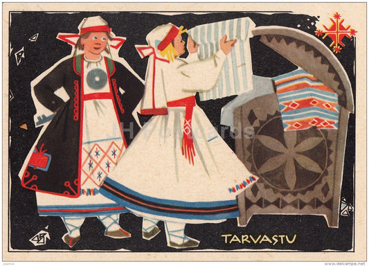 illustration de I. Raudsepp - Dawn and Dusk - costumes folkloriques - Contes de fées estoniens - 1979 - Estonie URSS - inutilisé