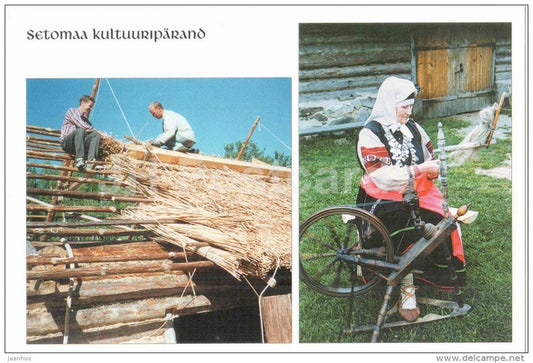Femme Seto filant - hommes fabriquant un toit de paille - Patrimoine de Setoland - Setumaa - Estonie - inutilisé