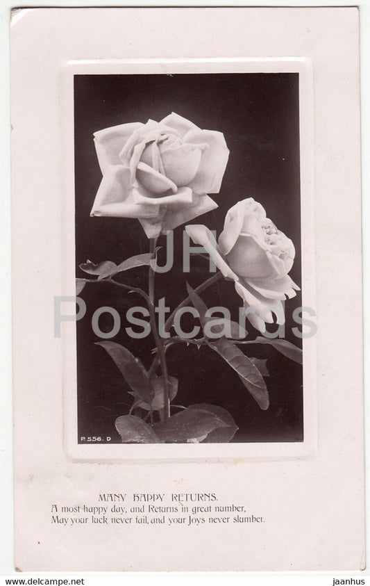 Carte de voeux d'anniversaire - Many Happy Returns - roses blanches - P 556 - carte postale ancienne - 1908 - Royaume-Uni - utilisé