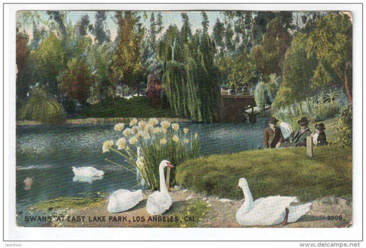 Cygnes à East Lake Park - Los Angeles - Californie - États-Unis - 9806 - carte postale ancienne - envoyée des États-Unis vers la Russie 1909 - utilisée
