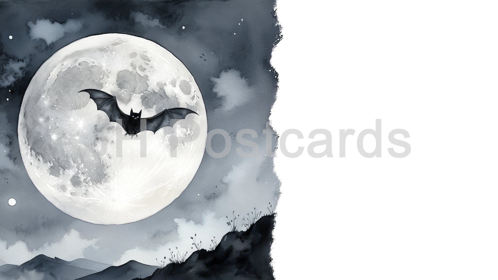 Image AI - Ombres célestes dans l'obscurité : une image spectaculaire d'une chauve-souris planant dans un ciel étoilé, sa silhouette se détachant sur la pâle lueur d'une pleine lune. Halloween. Dessin. Art. Illustration. Espace de copie. 1