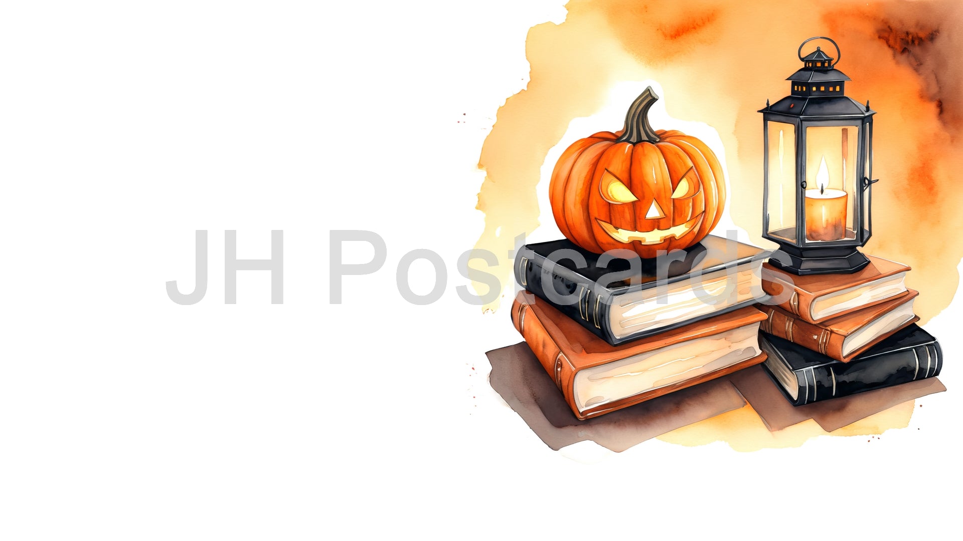 Image AI - Halloween Bookworm : Une aquarelle effrayante représentant une lanterne citrouille perchée sur une pile de livres, illuminée par une lanterne vacillante. Halloween. Dessin. Art. Illustration. Espace de copie. 1