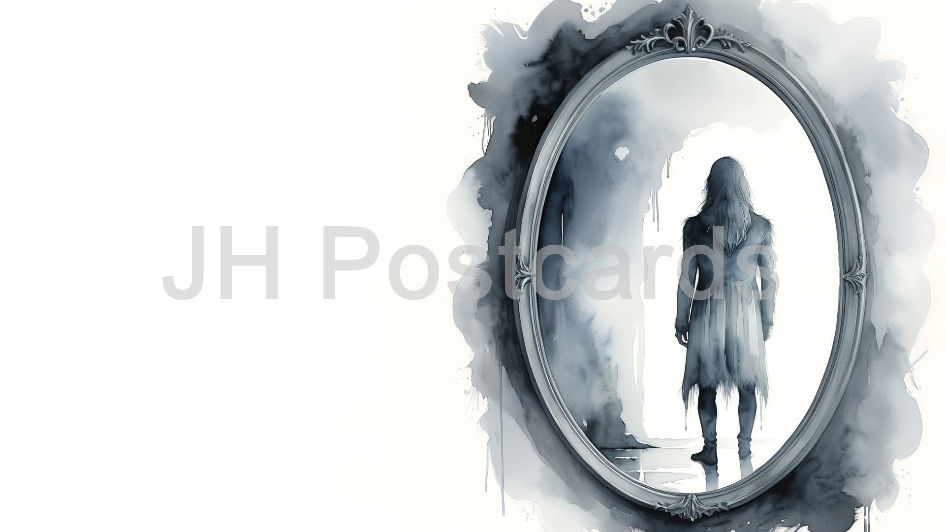 Image AI - Reflet obsédant : Une illustration aquarelle obsédante d'un homme reflété dans un miroir, entouré d'une atmosphère sombre et menaçante. Halloween. Dessin. Art. Illustration. Espace de copie. 3