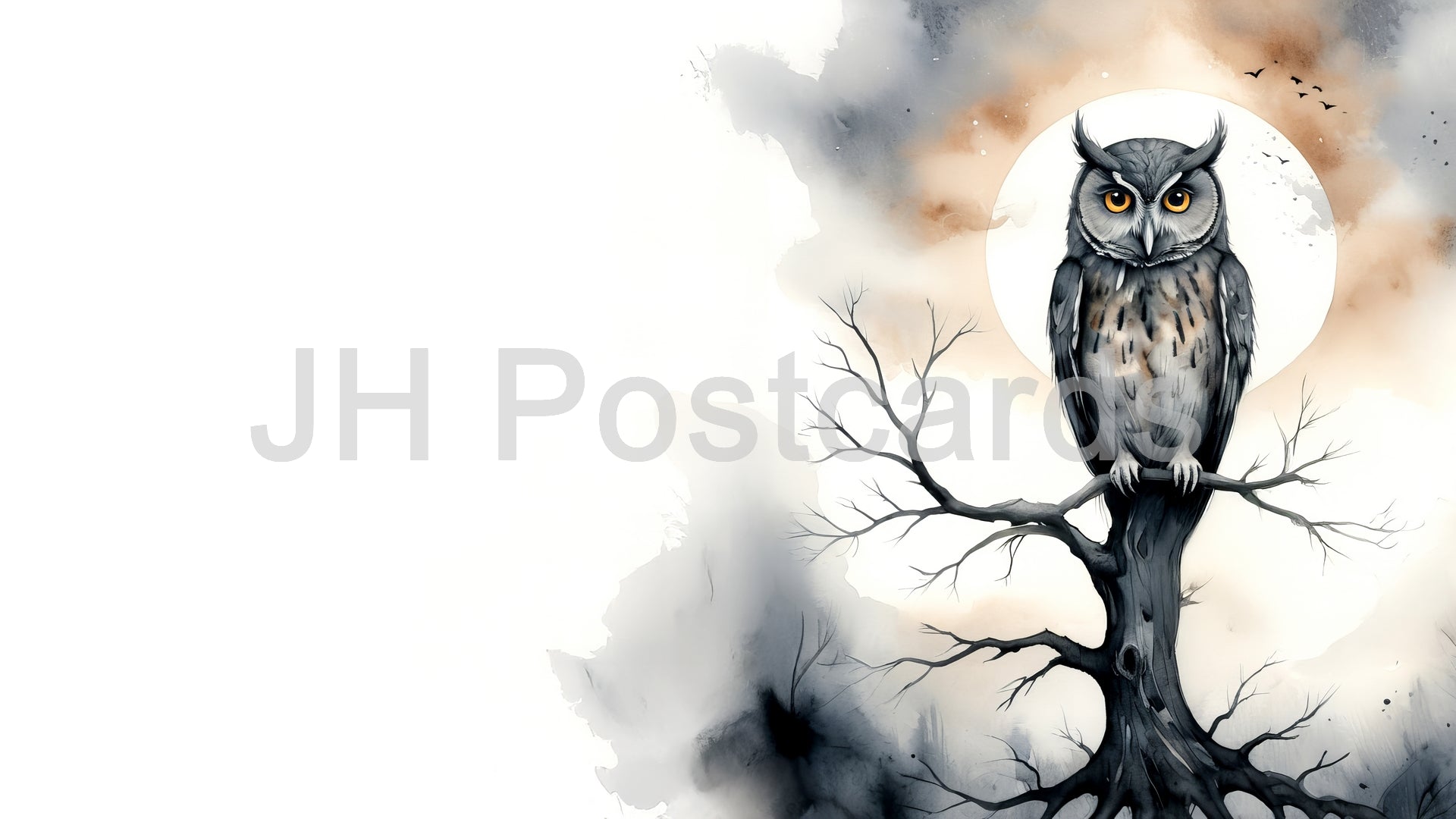 Image AI - L'œil vigilant de la nuit : une aquarelle envoûtante d'un hibou perché sur une branche d'arbre, regardant la lune. Halloween. Dessin. Art. Illustration. Espace de copie. 1