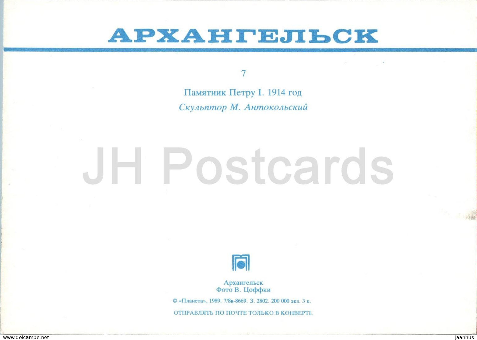 Arkhangelsk - monument à Pierre Ier - 1989 - Russie URSS - inutilisé