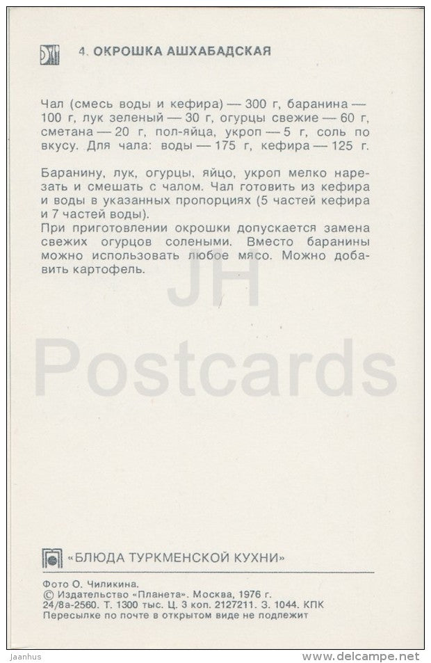 Ashgabat Okroshka - soupe - Plats du Turkménistan - Cuisine - 1976 - Russie URSS - inutilisé