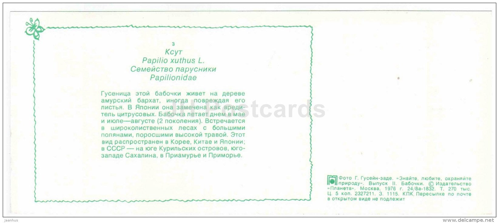 Machaon asiatique - Papilio xuthus - papillon - 1976 - Russie URSS - inutilisé
