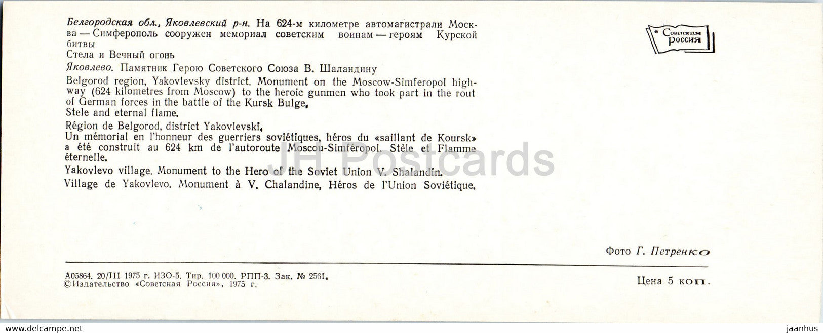 Région de Belgorod - Village de Yakovlevo - Monument de la Seconde Guerre mondiale - Monuments de la bataille de Koursk - 1975 - Russie URSS - inutilisé